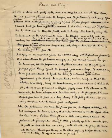 HAWKINS, Sir Anthony Hope (1863-1933). Novelist. Autograph Manuscript (unsigned, but with the author's name in in his hand in pencil in the left hand margin), headed 'River and Ring', 8 pages 4to on one side only, no date. Extensively revised and corrected on some pages, although not all. Contained in a brown buckram folder, gilt-stamped on the upper cover. The story does not appear to be a chapter from any of Hawkins's novels, and is presumably an independent short work. It tells of a policeman who encounters a young woman on the Embankment in London intent on throwing an engagement ring into the river, her account of the broken engagement, and of his seeing her again the following day as the bride in a society wedding at St Margaret's. Provenance: collection of Robert Collier, deaccessioned manuscript from Boston University, Howard Gotlieb Archival Research Center. [No: 24174] The first image shows the opening page only. The image links to a larger or more detailed version.