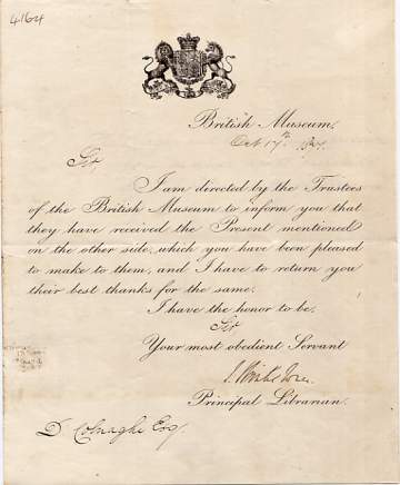 Letter Signed to D[ominic] Colnaghi, the text printed with the superscript ('Sir') and date (27 October 1877) in another hand. Thanking Colnaghi for his gift to the Museum of a silver plate engraving of The Virgin and Child by De Gheyn. £45 [No: 19929] |