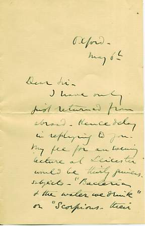 Autograph Letter Signed to Grimson, 2 pages 8vo, Oxford, 6 May no year. Setting his fee for a lecture at 30 guineas and offering to speak on either 'Bacteria & the water we drink' or 'Scorpions - their structure, habits & poison'. £48 [No: 20050] The image is of the first page only. |