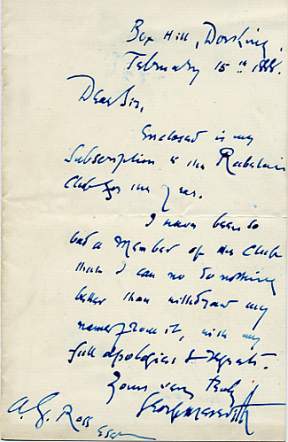 Autograph Letter Signed to A G Ross, 1 page 8vo, Box Hill, Dorking, 15 February 1888. Sending his subscription for the Rabelais Club and simultaneously resigning his membership. According to Cline (The Letters of George Meredith, Vol 2, page 696n) 'The Rabelais Club had come into existence in 1879 or 1880 and lasted until 1889 [perhaps Meredith's withdrawal was the last straw?]. The members included Lord Houghton, Sir Frederick Pollock, Walter Besant, J. Comyns Carr, Thomas Hardy, Oliver Wendell Holmes, Victor Hugo, Henry Irving, Henry James, R.L. Stevenson, etc.' The present letter appears to be unpublished. £385 [No: 20611] |