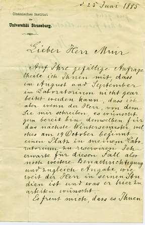 Autograph Letter Signed to Mr Muir, 1¼ pages 8vo, (traces of former mount), Chemical Institut, University of Strassburg, 25 June 1885. Informing him that the laboratory is closed in August and September, but that the gentleman in question can have a place for the winter semester, and asking what he wishes to study. £50 [No: 2066] |