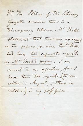 Autograph Letter Signed to Dr Sharpey (presumably the physiologist William Sharpey, 1802-1880), 3 pages 8vo, 18 Upper bedford Place, 4 May 1846. Advising Sharpey not to hasten into print in the 'Lancet' in the matter of a dispute. '... If you intend to write any thing in the Lancet in reply to its attack on yourself, I would beg to suggest that it would be adviseable for you to wait until the next number, in which the correspondence with Dr Lee is promised to be given, comes out, as I have been informed it will contain other letters, besides those published in the Literary Gazette of last Saturday, which you have probably seen. By this delay, you will have an opportunity of answering, once for all, the whole of the charges so malignantly brought forwards ...' £175 [No: 20994] The image is of the postscript only. |