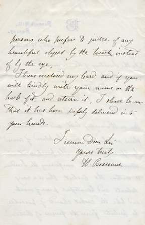 Autograph Letter Signed to the Secretary of the Turners Company, 2 pages 8vo, (slight remains of former mount), Denmark Hill, 'Tuesday Morning', no date [1880]. Delivering for safe-keeping a casket and scroll. On 13 May 1880 Bessemer was presented with the freedom of the City of London in an elaborate gold casket, evidently the object to which he here refers. '... [the scroll] is a very delicate and beautiful piece of work, and like the casket should if possible be protected from the fingers of those persons who prefer to judge of any beautiful object by the touch instead of by the eye. ...' £110 [No: 21266] The image is of the second page only. |