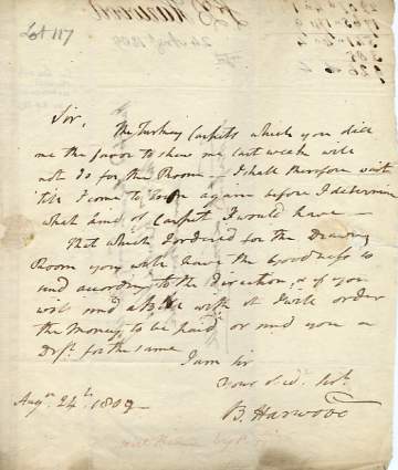 Autograph Letter Signed to Messrs Kent & Sons in London Wall, 1 page 4to with address on the reverse, 24 August 1809. Discussing carpets, rejecting one but ordering another. Ex Phillipps Manuscript 34765. £85 [No: 21872] |