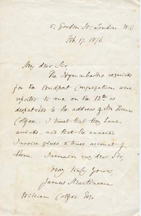 Autograph Letter Signed to William Colfox, 1 page 8vo, 5 Gordon Street, 17 February 1876. 'The Hymn books required for the Bridport Congregation were reported to me on the 12th as despatched to the address of Mr Thomas Colfox. I trust that they have arrived ...' £125 [No: 21976] |