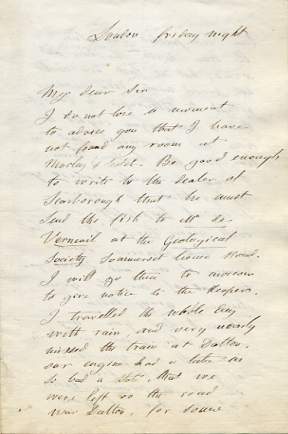 Autograph Letter Signed in English to E[dward] Wood, 2½ pages 8vo (laid down with the envelope-front), London, 'friday night', no date. Thanking him warmly for his hospitality, asking him to instruct the Scarborough dealer to send specimens to him at Somerset House, and describing the difficulties of his journey back to London. '... I travelled the whole day with rain, and very nearly missed the train at Dalton. Our engine had a tube in so bad a state, that we were left on the road near Dalton, for some time. We pushed our selves the train with our shoulders and arms, but at last we could not proceed much. We were obliged to telegraph to Darlington that a new engine ought to come and she arrived just in time for the London train. ...' £75 [No: 22085] The image is of the first page only. |
