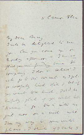 Autograph Letter Signed to Mary [Carmichael], 2¼ pages 8vo (some foxing) on black-edged paper, 5 Cannon Place, no date. Explaining that the ill health which plagued her for most of her life would prevent her from attending the concert, and asking if 'Nursie' could go in her place. '... She is with us just now on a visit until I see my way to some winter plans. I think if I take 3 months more rest I shall be able to try to work a little. ...' £45 [No: 22324] The image shows the first page only. |