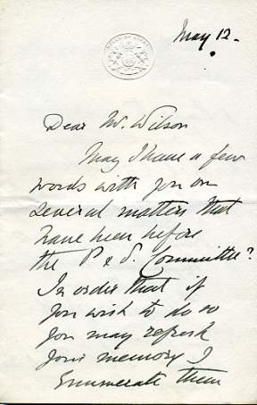 Autograph Letter Signed to Wilson, 2½ pages 8vo on embossed writing paper of the House of Lords, 12 May no year. Listing those subjects on which he wishes that they confer, including 'Powers to Corporations to run Omnibuses' and 'Notification of Births in Huddersfield'. £45 [No: 23864] The image shows the first page only. |