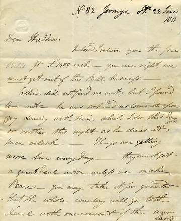 Autograph Letter Signed to Robert Haddow in Glasgow, 2 pages 4to with integral address-leaf, 82 Jermyn Street, 22 June 1811. Enclosing four bills for £1500 each (no longer included), and remarking 'you are right - we must get out of this Bill business'. Further despondent remarks concern the war. '... Things are getting worse here every day. ... You may take it for granted that the whole country will go to the Devil with one consent if the war lasts eighteen months. Ellice tells me that there will be a loss on the Ship building at Milford of £1500. ...'A statue of Oswald stands in George Square, Glasgow. £55 [No: 24068] The image shows the first page only. |
