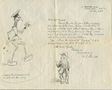 Amusing series of 7 Autograph Letters Signed, 5 of them illustrated, 5 to Newall and 2 to Mrs Newall, 10 Hodford Road, Child's Hill and Shaftesbury House, Cheadle Hulme, 10 September 1920 to 19 June 1923, where dated. Negotiating with Newall for the purchase of cartoons, the prices rising from 5 to 10 guineas, and tactfully declining to use any of Newall's ideas. 'Many thanks for your ... suggestion for a drawing of the Crown Prince. I will think it over, but at first sight I don't see more than a literal illustration, which being funny in itself I don't know how to make fun of. I wish they would get hold of him & his criminal father. ...'The letters to Mrs Newall were written after the death of Newall; the first is a letter of sympathy and the second offers her a picture at a knock-down price. '... I have had several applications for the drawing "A Matter of Courtesy" (Rudyard Kipling amongst them) but had not sold it up to the time I left home. I generally get ten guineas for my "Punch" drawings & have quoted that price in this instance to the others. If you will let it go no further I'll say £8.8.0 to you & feel honoured that it may live in your beautiful home. ...' £325 [No: 24080] The image shows a representative letter. The image links to a larger or more detailed version. |