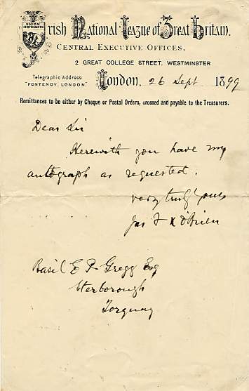 Brief Autograph Letter Signed to Basil E.P. Gregg in Sterborough, Torquay, 1 page 8vo, Irish National league of Great Britain, London, 26 September 1899. Complying with a request for his autograph. O'Brien, by this date the respected member of parliament for Cork City (previously for South Mayo) and secretary of the Irish National League of Great Britain, had been involved in an attack by the Fenians on the Ballynockan police barracks on the night of 3 March 1867. For this crime of treason he had been sentenced to be hanged, drawn and quartered, the last man to be sentenced to this punishment. The sentence was, however, commuted to penal servitude for life, and O'Brien was held initially in Mountjoy Prison, Dublin, and later in London, where he was kept in solitary confinement for fourteen months. After a period of hard labour in Portland he was released on 4 March 1869. £75 [No: 24099] |