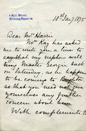 Autograph Letter Signed to Mrs Harris, 1½ pages 8vo, 4 Hill Street, Berkeley Square, 18 January 1875. Assuring her that his nephew will return Master Georgie to Brighton. £45 [No: 24202] The image shows the first page only. |