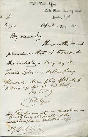 Autograph Letter Signed to the printer and antiquary J[ohn] G[ough] Nichols (1806-1874), 1 page 8vo, on writing paper of the Public Record Office, 27 April 1861. Sending some papers (no longer present). '... May my old friend Sylvanus Urbanas bring floreats - none of his offshoots & seekers equaled the old shark. ...'A note on the conjoint leaf records that a reader's ticket for the Record Office originally accompanied the letter and that Palgrave died two months after writing it. £45 [No: 24305] |