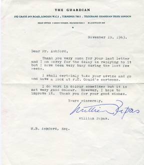 Typewritten Letter Signed to M.B. Ashford, 1 page 4to on writing paper of The Guardian, 19 November 1963. Promising to take Ashford's advice and have a look at the cartoons of F.C. Gould, and explaining that, while he sometimes works in colour 'it is not very good colour'. £45 [No: 24317] |