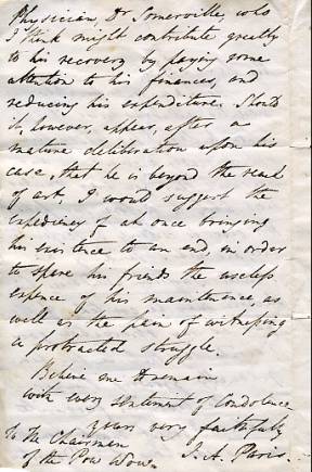 Autograph Letter Signed to 'The Chairman of the Pow Wow', evidently a fellow-physician, 2 pages 8vo, no place, no date. Backing any form of treatment his correspondent prescribes for what appears to be a hopeless case, hinting that the loss of the cook may have contributed to the failure in health, and advocating budgetary restraint. '... Should it, however, appear, after a mature deliberation upon his case, that he is beyond the reach of art, I would suggest the expediency of at once bringing his existence to an end, in order to spare his friends the useless expence of his maintenance, as well as the pain of witnessing a protracted struggle.'A letter evidently written in jest, and unlikely to relate to a human 'patient'. £55 [No: 24323] The image shows the final page only. |