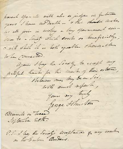 Two Autograph Letters Signed one (and probably the other) to John Gray, 4 pages 4to with one address-leaf, Berwick upon Tweed, 27 September 1835 where dated One letter acknowledging receipt of a Royal Medical Society Diploma, and expressing appreciation his long-standing membership of the Society. '... You surprise me much by your conclusions - they are most important to the geologists and very interesting to the naturalists and physiologists. ...' £125 [No: 24607] The image is of one page only. |