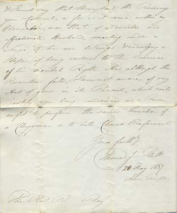 Autograph Letter Signed to the Revd D Ray, 2 pages 4to (tears in the folds of the second, blank sheet), no place, no date [watermark 1834]. A testimonial as to the suitability of Ray to function as a clergyman or to hold Church Preferment, owing to his conduct during a suit he had brought agains those allegedly conspiring to alienate his wife's affections. £60 [No: 24700] The image shows the second page only. |