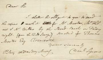 Autograph Letter Signed evidently to a bookseller or publisher, 1 page 8vo (oblong), Putney, 'Wednesday Morning, no date. Asking him to send three copies (of an unspecified work) for named recipients by the Stroud coach, directed to Thomas Master of Cirencester. Provenance: from a collection formed by A.M. Broadley in 1903. £65 [No: 24705] |
