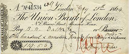 Cheque made out and signed by Trollope on the printed form of the Union Bank of London, the signature elaborately cancelled with pen-strokes. £350 [No: 24749] The image is of a similar cheque. |
