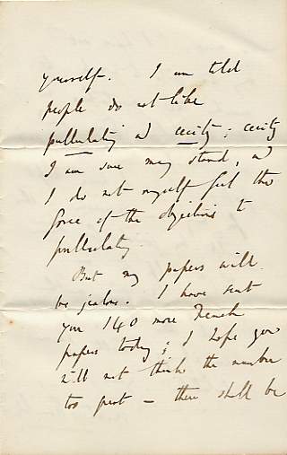 ARNOLD, Matthew (1822-1888). Poet and critic. 3 Autograph Letters Signed (one with initials), two to Mary Sybilla [Lyall] Holland and one probably to her husband, 10 pages 8vo, Cobham, 1881 and 1882 where dated Asking her to help him to mark examination papers ('I send about 140 French papers; if you can take charge of them, please mark them according to the scale followed by me ... I think the paper is better set than usual, and looking over and marking it is therefore a more straightforward business'), asking her to send the finished parcels to await him at the Athenaeum, and expressing disappointment that he had not seen her at Christmas. [1 January 1881]. In the second letter [5 January 1882] discussing his poetry and in particular two controversial words: '... I was beginning to feel so dazed & stifled with examination papers that all sense of there being such a thing in the world as poetry seemed gone. The real spur to accomplish the poem was the Drummonds' urging upon me that dear A.P.S. would have so much desired it; and one of my great pleasures, now that it is done, is to think that he would greatly have liked it. ... I am told people do not like pullulating and cecity; cecity I am sure may stand, and I do not myself feel the force of the objections to pullulating. ...'The offending words occur in the 14th stanza of Arnold's long poem written in memory of Arthur Penryn Stanley, dean of Westminster, Westminster Abbey. The third letter, tentatively dated in pencil 1881 but more probably from 1883, expresses the hope that Mrs Holland's papers would be waiting for him at the Athenaeum, and comments on reaching the age of sixty (Arnold reached that age on 24 December 1882). 'One must have reached sixty, and seen other old people lose their powers, and apprehended the loss of one's own, to appreciate fully such a cordial and delightful testimony as your note. ...'The present letters are not in The Letters of Matthew Arnold, ed. Cecil Y. Lang, 1996-2001, where two other letters to Mrs Holland are published. Mary Sybilla was the wife of Francis James Holland (1828-1907), son of the physician (Sir) Henry Holland. [No: 24773] The image is of one page only. The image links to a larger or more detailed version.