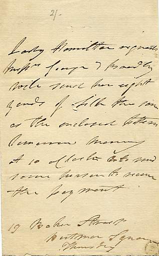 Autograph Letter (third person) to Messrs George & Broadley, 1 page 8vo with address-leaf, 19 Baker street, Portman Square, 'Thursday' [identified in another hand as 1818]. Asking for eight yards of silk to be delivered the following morning. Lady Anne was the constant companion of Caroline, princess of Wales, and accompanied the princess on the occasion that she attempted to attend the coronation of George IV. Her private papers were used during the latter part of her life without her permission in A secret history of the court of England from the accesssion of George III to the death of George IV, 1832, prompting her temporary exile to France. Provenance: from a collection formed by A.M. Broadley in 1903. £85 [No: 24783] The image is of the second page only. |