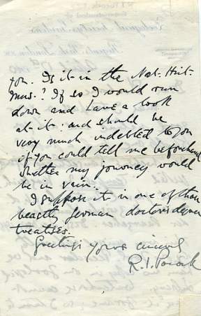 Autograph Letter Signed to Sherborne, 2 pages 8vo (note of identification in ink at the head), Zoological Society's Gardens, Regents Park, 17 April 1910. Enlisting Sherborne's assistance in locating a paper ('I suppose it is one of those beastly German doctor's degree treatises'). £45 [No: 24821] The image shows the second page only. |