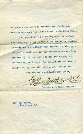 Typewritten Letter Signed to the Revd Dr Berry, 2 facing pages 8vo, Executive Mansion, Washington, 6 December 1897. Attempting to re-arrange an audience with the president for Berry and his friends, due to 'the peculiarly sad circumstances ... which surround the President and his household today'. £45 [No: 24889] The image shows the second page only. |