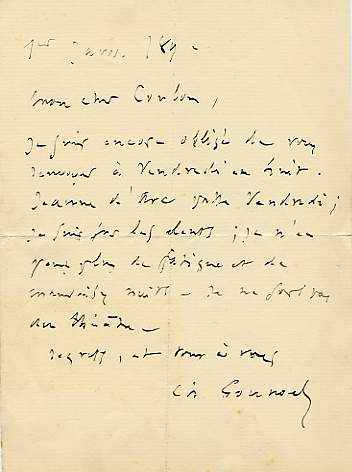Autograph Letter Signed to 'Mon cher Coulon', 1 page 8vo with integral blank leaf, 1 January 1889. Mentioning Jeanne d'Arc, perhaps the mass he composed in honour of her memory, and complaining of toothache, fatigue and bad nights. Gounod's correspondent is perhaps the bass, Théodore-Jean-Joseph Coulon, who sang in a number of Gounod's works over the years. £250 [No: 25058] |
