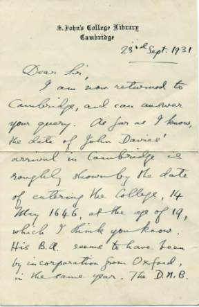 Autograph Letter Signed to Ifan Kyrle Fletcher, 2 pages 8vo, St John's College Library, Cambridge, 23 September 1931. Conveying information about the university career of John Davies who arrived at Cambridge in 1646. '... His B.A. seems to have been by incorporation from Oxford ... . At the present day matriculation of an Oxford man takes place just before the ad eundem degree.' £45 [No: 25094] The image shows the first page only. |