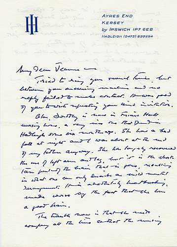 Five Autograph Letters Signed ('Ralph') to Philip and Jeanne Bennett (together or separately), 5 pages small 4to and 2 cards, Ayres End, ca 1989 to 1993. With an invitation to his 80th birthday party and the menu for the occasion, two envelopes etc. Cordial letters to neighbours who were also friends. 'Just off to Wales in a flurry of switching from morning dress and black tie to forestry gear [he was an enthusiastic forester and owned woodland in Wales and Australia as well at his home in Suffolk]. ... It seems only yesterday you gathered us all at the Garrick; and even if the borsche [sic]hadn't any cream, Jeanne, and the borshce wasn't borsche in your opinion, the food was still very good and the wines delicious. ... I fear the wine and the food will not be quite Garrick at my tented party, and being the day it is, the rain will probably be dripping down our backs. But I do have a harpist and a flautist ... I hope to offer you something other than sausage rolls! ...'Two letters discuss his wife's illness and her funeral: '... I was so glad you could both come here to see her off on the greatest of all her many adventurous journeys. Sounds corny, but she loved travel, and quite recently when I asked why she preferred her room to being taken down to the lounge, she said, 'Here I feel I am going somewhere'. ... wasn't it marvellous on the sea shore and everything went so perfectly. ...' £250 [No: 25117] The image is of one page only. |