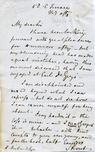 Autograph Letter Signed to H. Bickner, 1 page 8vo, '5 D[e] C[respigny] Terrace, Thursday no date. Cringingly crying off an invitation that he had previously accepted ('Pray pardon it - the loss is mine and I greatly regret it'), because he has double-booked an engagement with Earl de Grey. £45 [No: 25207] |