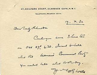 Autograph Letter Signed on a correspondence-card to Lady Rhondda, 47 Chiltern Court, Clarence Gate, 19 October 1932. Inviting her to tea and 'to talk about this Woman's Communist Party you couldnt talk about the other day.' The letter is probably to Margaret Haig Thomas, Lady Rhondda, a prominent business woman and equal rights feminist, rather than her mother Sybil Margaret Thomas, Viscountess Rhondda (1857-1941, suffragette). £250 [No: 25264] |