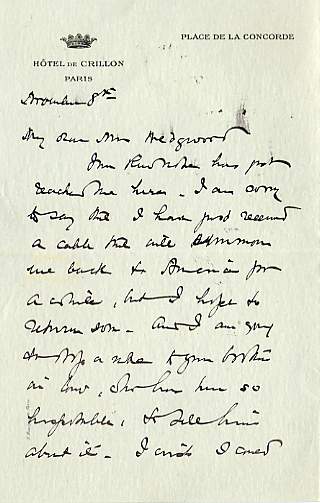 CHURCHILL, Winston (1871-1947). American novelist, politician and painter. Autograph Letter Signed to Mrs Wedgewood in Kensington, 1½ pages 8vo (facing) with envelope, Crillon Hotel, Paris, 8 November 1917. Explaining that he had received a cable summoning him back to America and regretting that he could not dine with her. The American novelist was an occasional correspondent of his more famous British namesake. It was the latter who agreed to use to initial 'S' (from Spencer) in his signature to prevent any confusion between them (their lives having been to some extent similar), and the novelist concurred in the arrangment with the proviso that if he too had had a middle initial he would have used it. [No: 25346] The image is of the first page only. The image links to a larger or more detailed version.