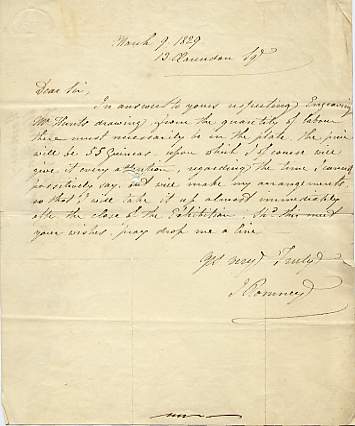 Autograph Letter Signed to an unnamed correspondent, 1 page 4to, 13 Clarendon Square, 9 March 1829. Naming his price to engrave a drawing. 'In answer to yours respecting engraving Mr Hunt's drawing from the quantity of labour there must necessarily be in the plate the price will be 55 Guineas - upon which I of course will give it every attention. ...'The identity of Hunt has not been established. It could be William Henry Hunt (1790-1864) or Andrew Hunt (1790-1861), or indeed another of that surname. Together with an admission ticket to the Artists' Conversazione at Freemasons' Tavern 1827, made out for W[illiam] S. Hall and signed by Romney. £85 [No: 25353] The image links to a larger or more detailed version. |