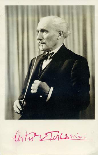 Signed Photograph, 19 x 12 cms. (7½ x 4½ inches), signed in red ink the white space at the foot. Showing Toscanini in a pensive mood, holding his baton to his lips. £350 [No: 25579] |