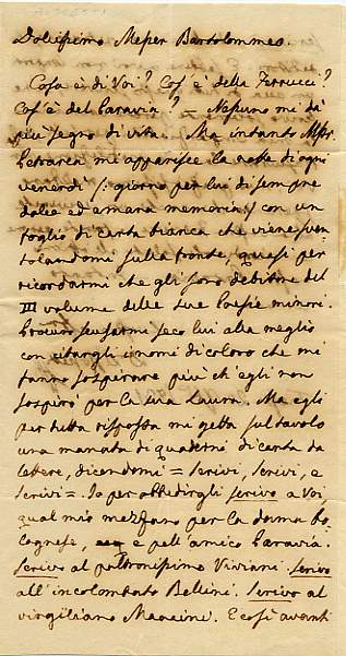 Amusing and affectionate Autograph Letter Signed (in Italian) to Bartolommeo Gamba in Venice, 2 pages 8vo with address-leaf, Trieste,20 November 1831. Complaining that he has no news of him nor of his other friends Ferrucci and Paravia, though he is visited every Friday night by Petrarch (Friday being a bittersweet day for the poet), who brandishes a sheet of blank paper at him 'quasi per ricordarmi que gli sono debitore del III volume delle sue Poesie minori', then throws a pile of notebooks onto the table and tells him to 'write, write, write'. So that is what he is doing - writing to Gamba, whom he calls his 'pimp' ('mio mezzano par la donna bolognese'), to Paravia, to 'that lazybones' Viviani, to Bellini, to 'the Virgilian' Mancini, and to all his Petrarchan debtors. Rossetti was appointed professor of Italian at Kings College London in 1831. Friday (venerdi, the day of Venus, and the sixth day of the week) held a special significance for Petrarch, and his beloved Laura, according to him, died on Good Friday. £425 [No: 25589] The image is of the first page only. The image links to a larger or more detailed version. |