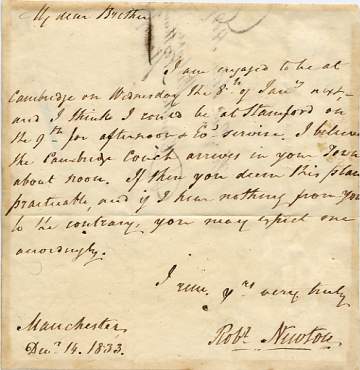 Autograph Letter Signed to the Revd John Hodg[address incomplete] in Oundle, 1 page 4to (trimmed, touching the ends of the lines on the right hand side), Manchester 14 December 1833. Describing his itinerary, and promising to get to Manchester. 'I am engaged to be at Cambridge on Wednesday the 8th of Jany next, and I think I could be at Stamford on the 9th for afternoon & evg service. I believe the Cambridge coach arrives in your Town about noon. If then you deem this plan practicable, and if I hear nothing from you to the contrary, you may expect me accordingly.' Newton was four times president of the Wesleyan conference and travelled widely, particularly after rail travel became possible. His letters rarely appear on the market. £125 [No: 25620] The image links to a larger or more detailed version. |