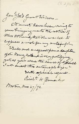 Autograph Letter Signed to James Grant Wilson (1832-1914, editor and author and civil war general), 1 page 8vo in a shaky hand, Boston, 27 November 1872. Supplying his autograph for Miss Holland (probably one of the four daughters of Sir Henry Holland). '... While such a request from a daughter of Sir Henry Holland is very gratifying, yet, as you were the cause of it, should I not direct the autograph to you?' £250 [No: 25647] |