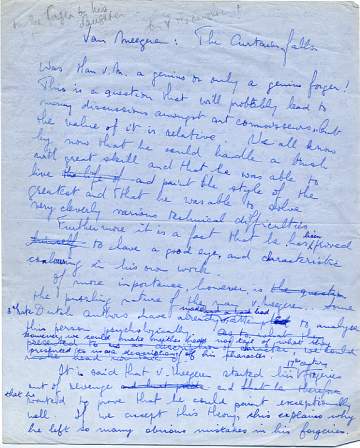 Manuscript Apologia in the form of an article 'The Curtain Falls', attributed to van Meegeren's daughter, presumably Pauline (known later as Inez). Four pages 4to on separate leaves of flimsy blue paper, heavily corrected in parts [1950]. Commencing with a brief attempt to explain van Meegeren's motives, and describing his depredations on the international art market as 'this painful incident', the article gives a preview of the forthcoming auction of the forger's assets ('The whole estate of the bankrupt painter, comprising 738 lots, will be auctioned by the well-known broker, Paul Brant') and lists several of the (genuine) pictures that will be included, explaining that the house had already been sold prior to the auction. Van Meegeren had filed for bankrupty in 1945, two years before his trial and conviction for forgery and his death in 1947. Far from being penniless, however, he had, by the subterfuge of a nominal divorce from his wife, handed over sufficient wealth to enable her, following his death, to live for many years in considerable luxury. The auction of his property took place on 5 and 6 September 1950, the house having been sold on the 4th [Wikipedia]. It seems that this manuscript was written shortly before the date of the sales. '... The last act of the drama is, then, about to begin. The curtain falls irrevocably and all that remains are the fooled experts, the theorists and psychologists to get into each others hair. For the good name of art experts in general it is essential that this painful incident be forgotten as quickly as possible, in particular for the memory of a man who made mistakes, and who would have paid the penalty, if death had not intervened.' £225 [No: 25741] The image is of the first page only. The image links to a larger or more detailed version. |