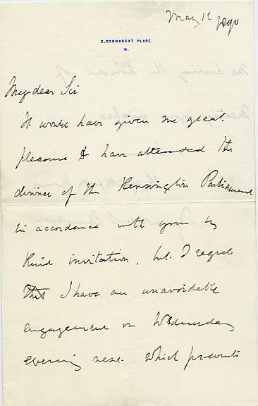 Autograph Letter Signed to an unnamed correspondent, 1½ pages 8vo with blank second leaf, in good and clean condition, 2 Connaught Place, 12 May 1890. Declining to attend 'the dinner of the Kensington Parliament' [sic], on the grounds of having another unavoidable engagement. £150 [No: 25890] The image is of the first page only. |