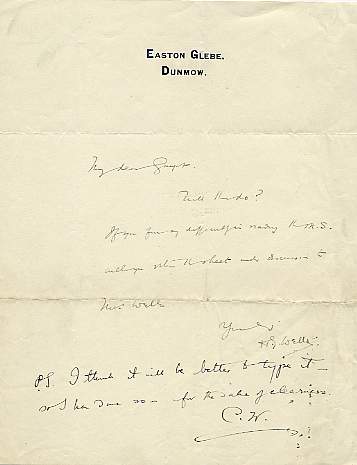 Autograph Letter Signed to Guyot, 1 page 4to, Easton Glebe, Dunmow, no date. Asking 'Will this do?', referring to a manuscript he is sending (no longer present) and suggesting that if he has any difficulty in reading it he refer to Mrs Wells. A note at the foot by Wells's wife Catherine suggests typing the manuscript 'for the sake of clearness'. £275 [No: 26044] |