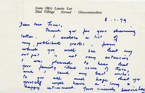 Autograph Letter Signed to [E. Stanley] Jones, 1 page 8vo (oblong), Slad Village, 8 January 1979. Together with an annotated list on a separate sheet. Sending a list of his publications ('from which you will see that my output is not very extensive'), thanking Jones for his appreciation and wishing him well in his retirement. The list is taken from a page irregularly cut from a copy of A Rose for Winter and is not complete; the missing publications are written in by Laurie Lee. He has included the names of the publishers and the information that those starred are also available in Penguin paperback. £250 [No: 26078] The image links to a larger or more detailed version. |