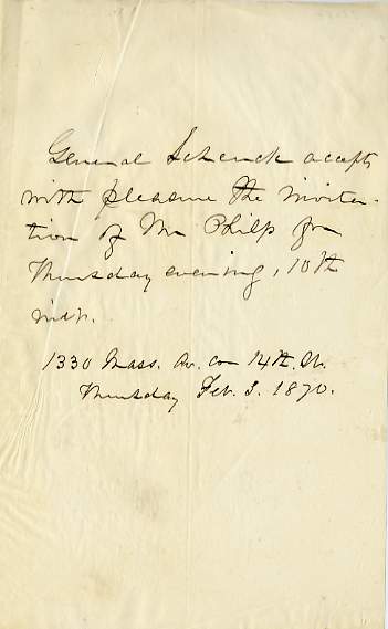 Autograph Letter (third person), 1 page 8vo on flimsy paper, 1330 Mass[achuetts] Avenue ('cor[ner] 14th. W.), 3 February 1870. Accepting an invitation from Mr Philp for the following Thursday. £45 [No: 26267] |