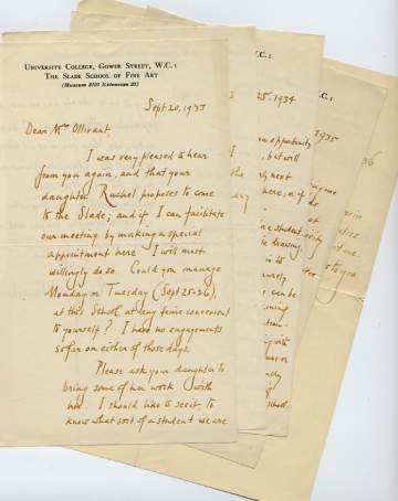 Series of five Autograph Letters Signed to Mrs Ollivant (2) and her daughter Rachel (3), 7 pages 8vo and 4to, University College (4) and Hampstead, 1933-1936. Largely concerned with the admission of Rachel Ollivant as a student at the Slade School of Fine Art, and discussing her work at some length with her mother. Schwabe had been an official war artist during World War I, and succeeded Henry Tonks as Slade Professor in 1930. £85 [No: 26273] |