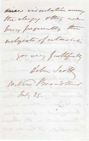 Autograph Letter Signed to John Churchill (1801-1875, medical publisher), 2 pages 8vo (second blank sheet cut in half), no place, no date (watermark. 1844). Diffidently suggesting a 'few advertisements in the Record Newspaper, it has an extensive circulation among the clergy & they are very frequently the subjects of cataracts'. Scott's Cataract and its Treatment had been published by Churchill in 1843. £45 [No: 26295] The image shows the second page only. |