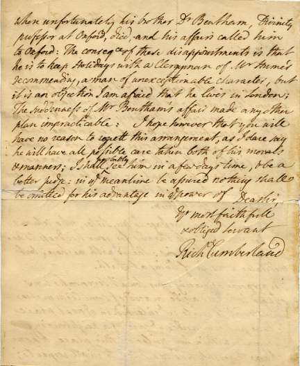 Autograph Letter Signed to an unnamed correspondent ('Dear Sir'), 2 pages 4to (small splits and one tear professionally repaired), Tetworth, 9 August no year (ca 1794). Asking that he and his sister should be kept informed when Henry Alcock of Waterford Castle dies. '... I need not say that there is some delicacy to be observed in this commission. ...' He also informs him that his son had been put under the care of a clergyman during the holidays. '... he is to keep Holidays with a Clergyman of Mr Hume's recommending, a man of unexceptionable character, but it is an objection I am afraid that he lives in London. The suddenness of Mr Bentham's affair [i.e. his death] made any other plan impracticable: I hope however that you will have no reason to regret this arrangement, as I dare say he will have all possible care taken both of his morals & manners. ...'James Bentham (1709-1794, professor of theology at Oxford) had died on 17 November 1794. The reference to Mr Hume is unlikely to be to the philosopher David Hume (1711-1776) in view of the date. £550 [No: 26310] The first image of the second page. The image links to a larger or more detailed version. |