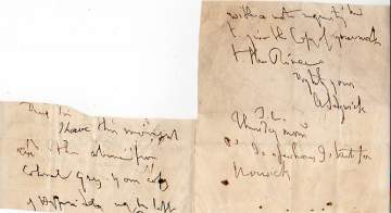 Autograph Letter Signed to an unnamed correspondent, 1½ pages 8vo on the second and third facing pages (first page cut in half), no place, 'Thursday morn' no date. Suggesting that his correspondent's copy of Babbington might be 'left with a note requiring him to give the Copy of your note to the Rivers'. The letter, in a shaky hand, is written on the back of a black-edged letter mentioning the scholar Churchill Babington's 'publication'. A postscript notes that he is to start for Norwich in a few hours. £65 [No: 26316] |