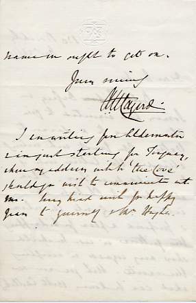 Autograph Letter Signed to [Thomas] Hughes, 2 pages 8vo, Piccadilly, ?21 October ?1851. Arranging to hold a dinner for the painter and sculptor George Frederic Watts. ('I have also spoken to Phillips who ... proposed a plan for kidnapping the pittore in case he should show any coyness in accepting the invite. ...') £120 [No: 26557] The image is of the second page. The image links to a larger or more detailed version. |