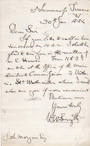 Autograph Letter Signed to S.A. Morgan, 1 page 8vo, 5 Inverness Terrace, 30 January 1884. Arranging an appointment either at his home in Inverness Terrace or at the office of the Mine Accidents Commission in Westminster. In 1879 Smyth was appointed chairman of a royal commission on accidents in mines. As a result of the commission's extensive investigations into working practices in mines, the Coal Mines Regulation Act of 1887 was passed. £55 [No: 26570] |