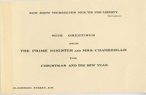 Chamberlain's Christmas Card for 1939, unsigned, but a remarkable relic of what must have been his most difficult Christmas, 110 x 175mm. (4½ x 7 inches). The card is embossed in gilt on the front 'Christmas 1939' and is adorned with a red ribbon. Neville Chamberlain had become prime minister on 28 May 1937 at a time when the policy of appeasement was already established by the Foreign Office. He was a strong advocate of British rearmament, especially of the air force, for which purpose he raised the rate of taxation in the 1937 budget. The sequence of events leading to the outbreak of war with German on 3 September 1939 is well known to history. Anthony Eden and Winston Churchill now returned to the government and Chamberlain, although unhappy with his role as a war leader, became firmly opposed to any kind of rapprochement with Hitler without there being an end to Nazi policy. Christmas 1939 could hardly have been a happy time for Chamberlain. The strange quietness engendered by the so-called 'phoney war' came to an end on 10 May 1940 with Hitler's invasion of France. On that day Chamberlain resigned and Churchill became prime minister. 1939 was Chamberlain's last Christmas. Soon after his resignation he became aware of symptoms of the abdominal problem which was confirmed as the cancer from which he was to die on 9 November 1940. £125 [No: 26716] The image shows the printed message. The image links to a larger or more detailed version. |